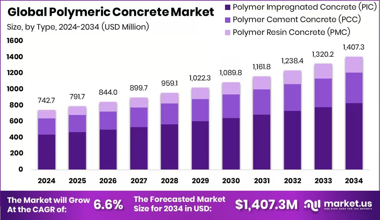 The global polymeric concrete market is projected to reach approximately USD 1,407.3 million by 2034, rising from USD 742.7 million in 2024, with a CAGR of 6.6% between 2025 and 2034. North America currently leads the market with a value of USD 320.8 million, accounting for 43.2% of global demand.